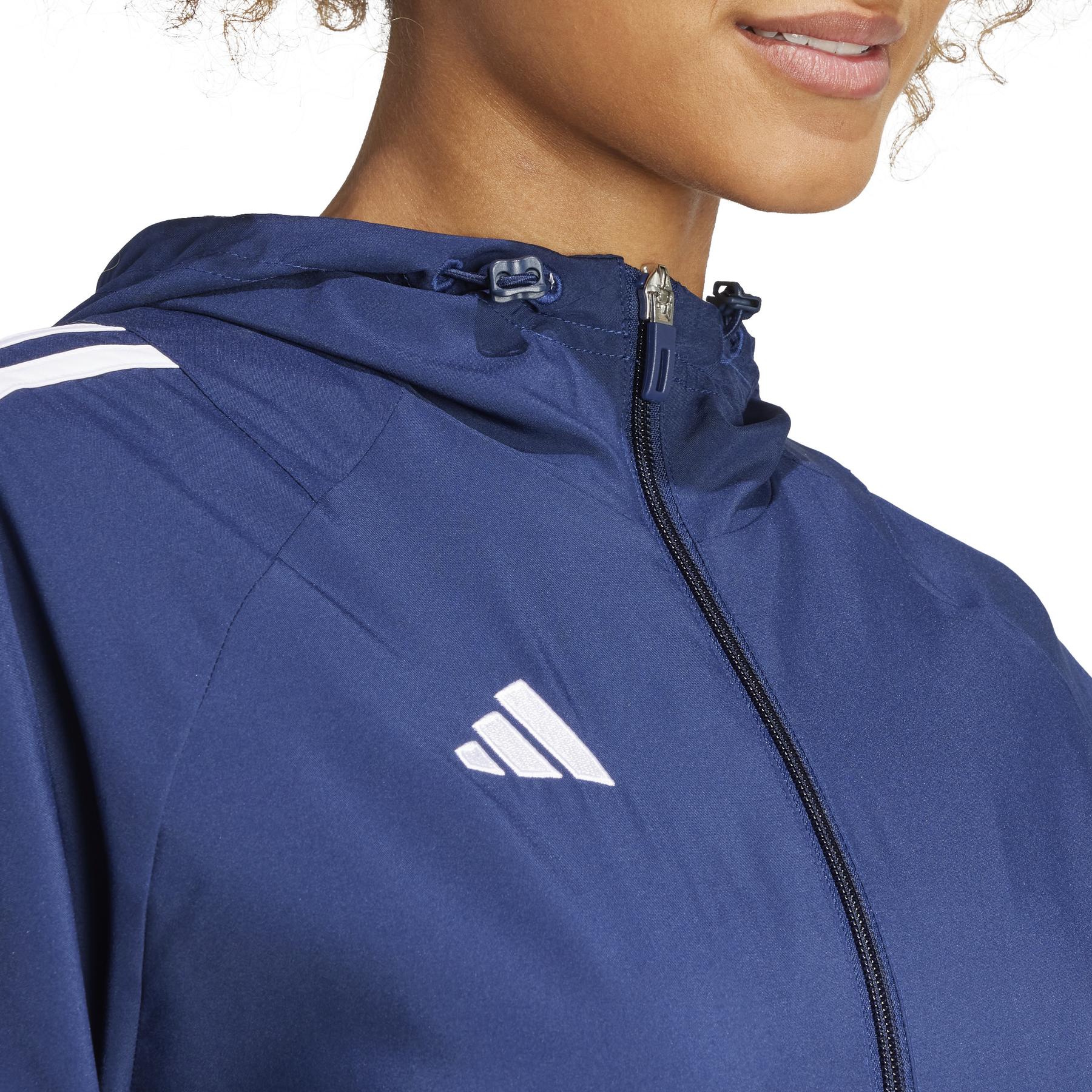 Stay dry and perform in style with the adidas Tiro 24 eco-friendly, mesh-lined waterproof women's soccer jacket.